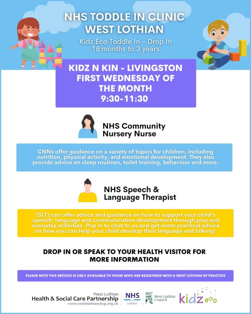 Families can come along to the Toddle In sessions to discuss their child’s communication with a Speech and Language Therapist and will receive key strategies to try at home. These drop in sessions are to support children from 18 months to 3 years old and are provided jointly with NHS Community Nursery Nurse.