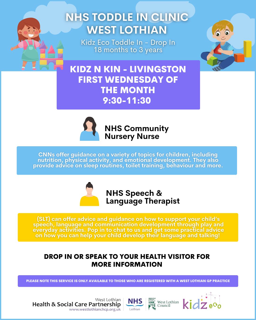 Families can come along to the Toddle In sessions to discuss their child’s communication with a Speech and Language Therapist and will receive key strategies to try at home. These drop in sessions are to support children from 18 months to 3 years old and are provided jointly with NHS Community Nursery Nurse.